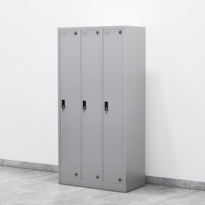 Mẫu tủ này có kích thước W1000 x D450 x H1830mm, phù hợp cho nhu cầu lưu trữ cơ bản của cá nhân hoặc không gian nhỏ. Tủ được chia làm 3 khoang lớn, mỗi khoang có khóa riêng, thích hợp để cất giữ quần áo, túi xách, tài liệu hoặc vật dụng có kích thước lớn. Đây là lựa chọn phù hợp cho phòng làm việc ít nhân sự hoặc khu vực thay đồ.