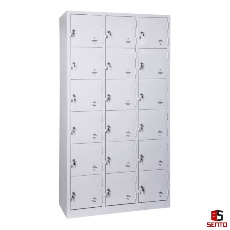 Tủ 18 ngăn có kích thước W915 x D450 x H1830mm, thường được sử dụng trong các khu công nghiệp, nhà máy hoặc cơ sở đào tạo lớn. Mỗi công nhân, học viên đều có ngăn riêng để cất giữ đồ cá nhân. Sản phẩm này giúp nâng cao tính kỷ luật, gọn gàng và chuyên nghiệp trong môi trường tập thể.