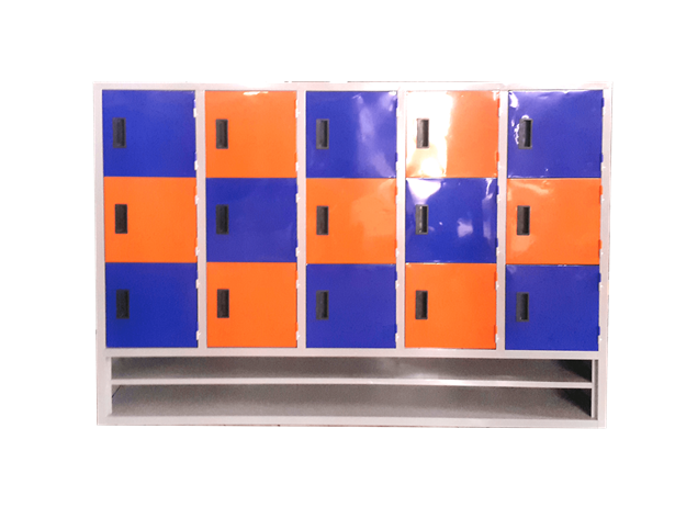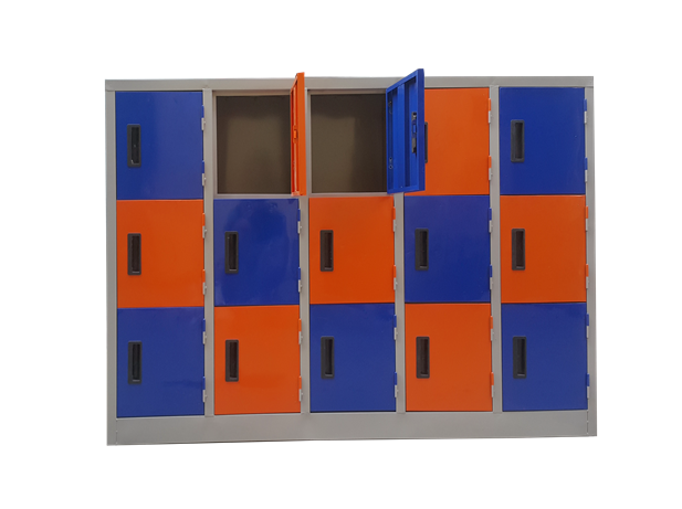 Tủ đựng đồ 15 ngăn có giá để dép, được chia làm 15 ô riêng biệt, mỗi ngăn có tay nắm âm để mở tiện lợi, bên dưới có 2 tầng để giày dép. Cánh tủ có chốt tự động giữ cánh ko bị tự mở khi thả tay. Tủ thường được dùng nhiều cho các trường mầm non, các nơi hay để đồ cá nhân. Thân tủ màu ghi, cánh màu xanh và cam hoặc sơn màu theo yêu cầu của khách hàng.