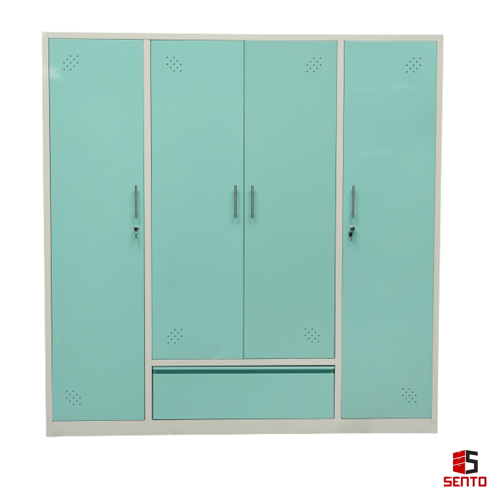 Tủ có kích thước lớn (C1830 x R1800 x S500mm), được thiết kế với 3 khoang lưu trữ chính – một khoang lớn ở giữa và hai khoang nhỏ hai bên – giúp tối ưu hóa không gian để quần áo và các vật dụng cá nhân. Tủ có 4 cánh cửa, mỗi cánh đều được trang bị khóa riêng biệt, mang lại sự an toàn và tiện lợi khi sử dụng.