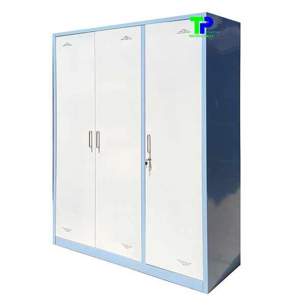 Sản phẩm tủ sắt đựng quần áo sơn tĩnh điện được bao trùm một màu xanh ngọc nhã nhặn tạo cảm giá dễ chịu cho người dùng. Bên cạnh đó, tủ được thiết kế 3 khoang và 3 cánh kính có hoa văn trang trí. Mỗi khoang có ổ khóa riêng biệt tạo độ an toàn cao và tính thẩm mỹ cao cho sản phẩm.